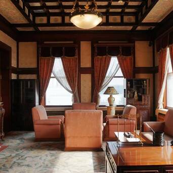 4. 宫内府,是溥仪及其宫延的辅弼机构,宫内府大臣先后由沈瑞麟、熙洽担征,宫内府次长均为目本人。宫内府始建于1909年,原为吉黑榷运局局长公馆。后经两次翻修重建。1932年溥仪入住后改宫内府办公地,统辖掌管宫内一切事物。
